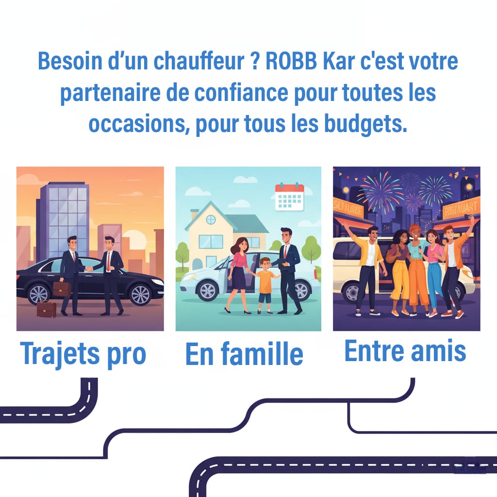 Que ce soit pour vos déplacements professionnels, vos voyages en famille ou vos sorties entre amis, ROBB KAR vous accompagne avec ponctualité, confort et sérénité.